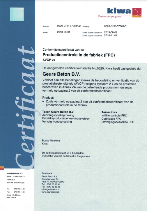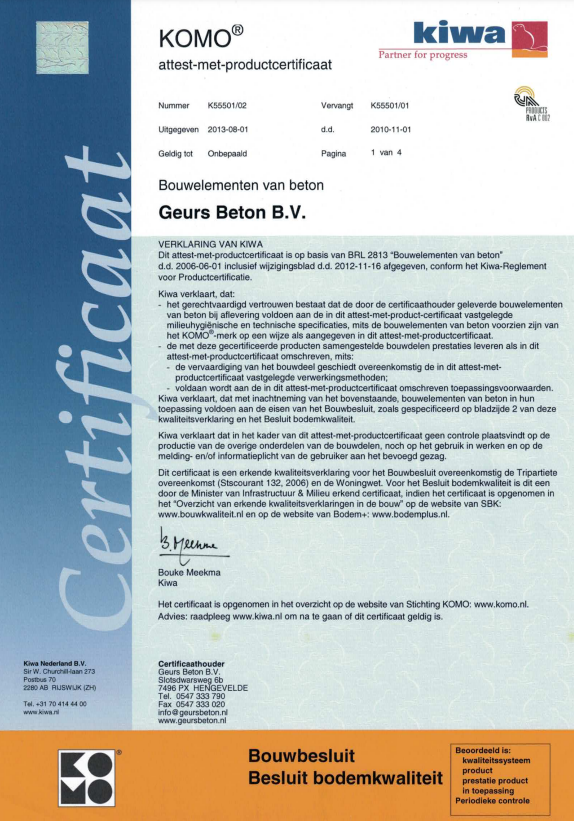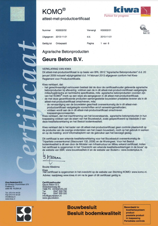 Geurs Beton hanteert strikte kwaliteitsvoorwaarden voor haar producten. Naast eigen kwaliteitscontroles beschikken wij ook over KOMO-certificaten voor agrarische betonproducten en bouwelementen van beton. En met onze Eurocode certificaten voldoen onze producten aan de gestelde CE normen.