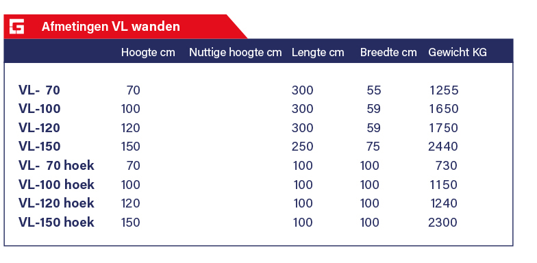 Ons oudste, en tevens bekendste model, is de VL-wand. In de volksmond ook wel halve maan wand genoemd. Dit doordat hij een rond lopende voet heeft. Door de rondlopende voet heeft de wand geen wapening nodig en is hij naar verhouding goedkoper dan de gewapende wanden. De wand wordt veel ingezet als silowand en als grondkering in o.a. tuinen.